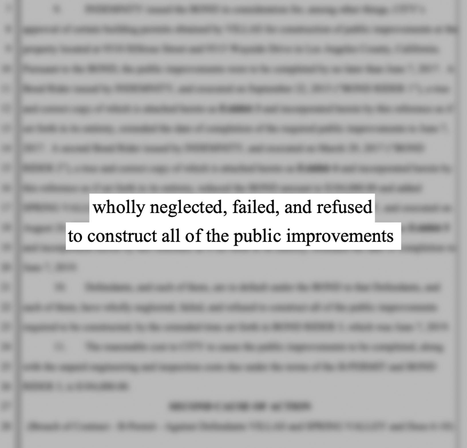LA City Attorney says Andrew Nowaczek "wholly neglected, failed, and refused to construct all of the public improvements required to be constructed". Insurance company steps in to pay the city, and pursues Andrew to pay up.