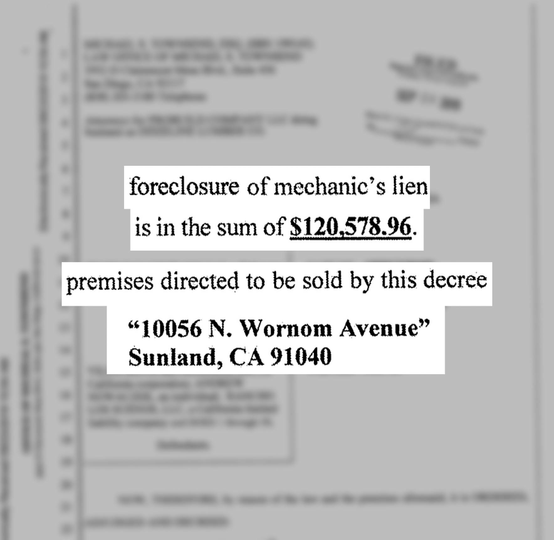 Court awards plaintiffs Dixieline Lumber $132,012.54 for Andrew's breach of contract, and a further $120,578.96 in foreclosure of a mechanic's lien on the 10056 Wornom Ave property.