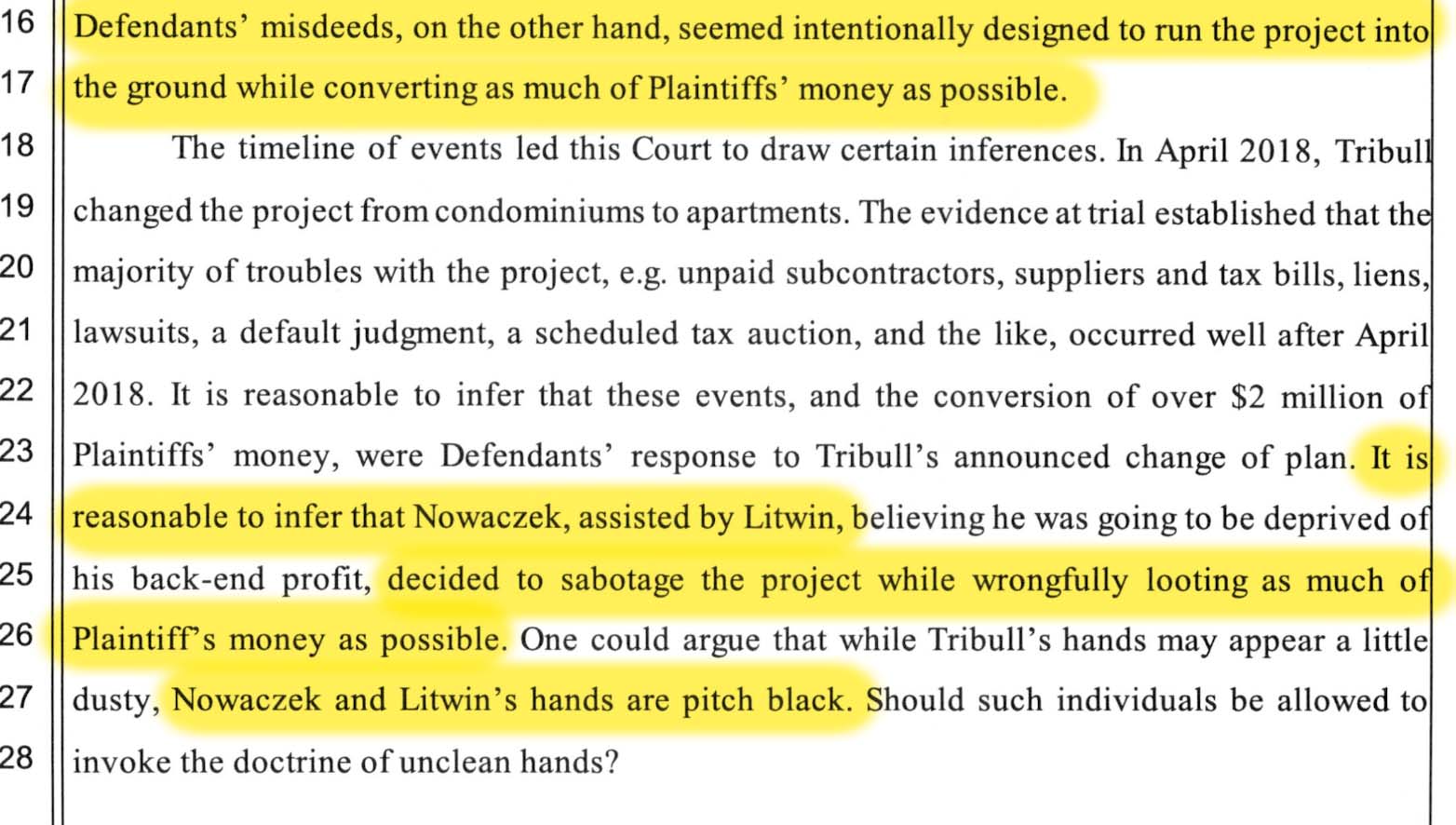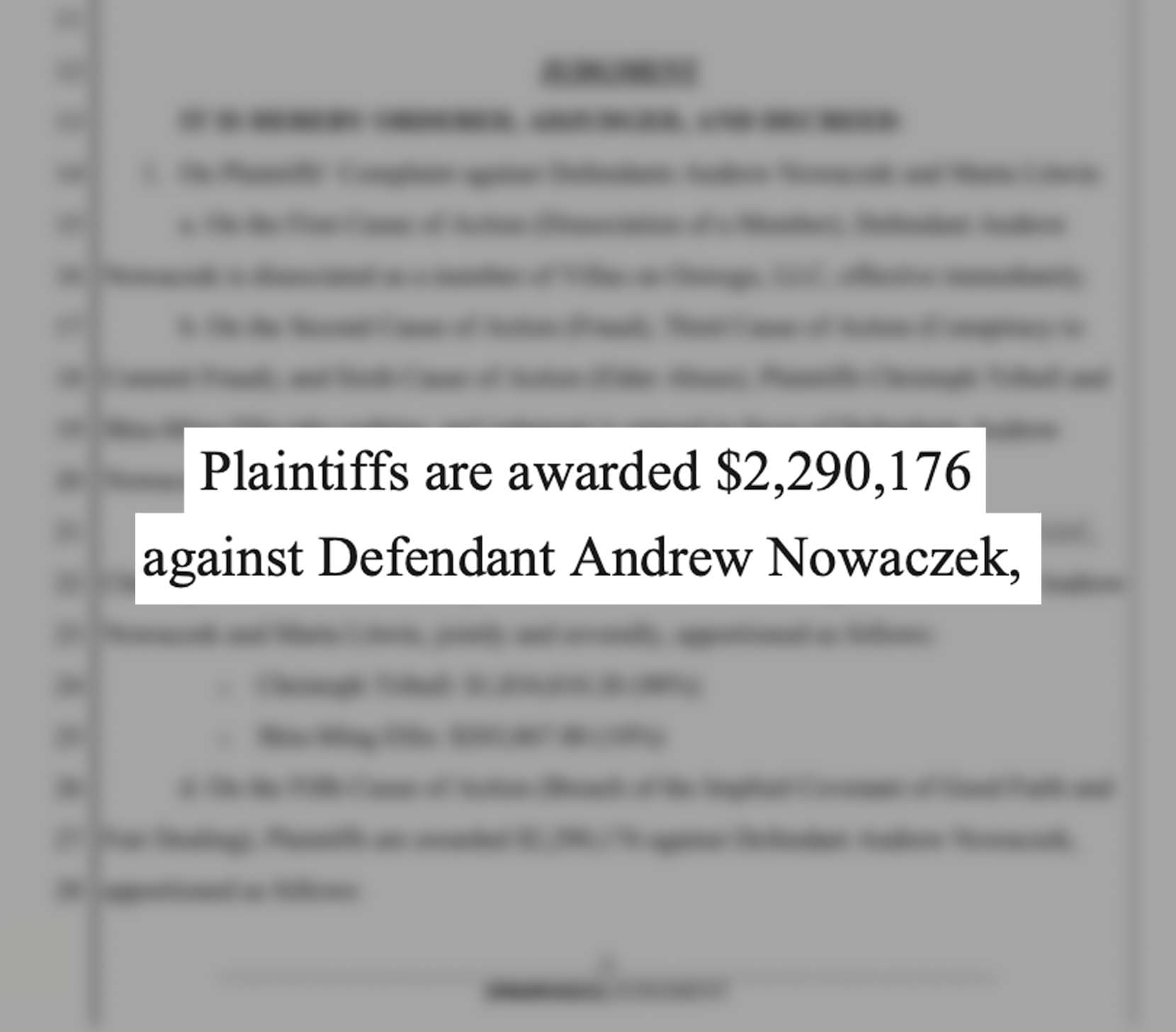 In case no. 20GDCV01045, (styled in part VILLAS ON OSWEGO LLC v ANDREW NOWACZEK), the court has ordered Andrew to pay $2,290,176 for his misconduct in ripping off his business partners on a construction project in Pasadena.