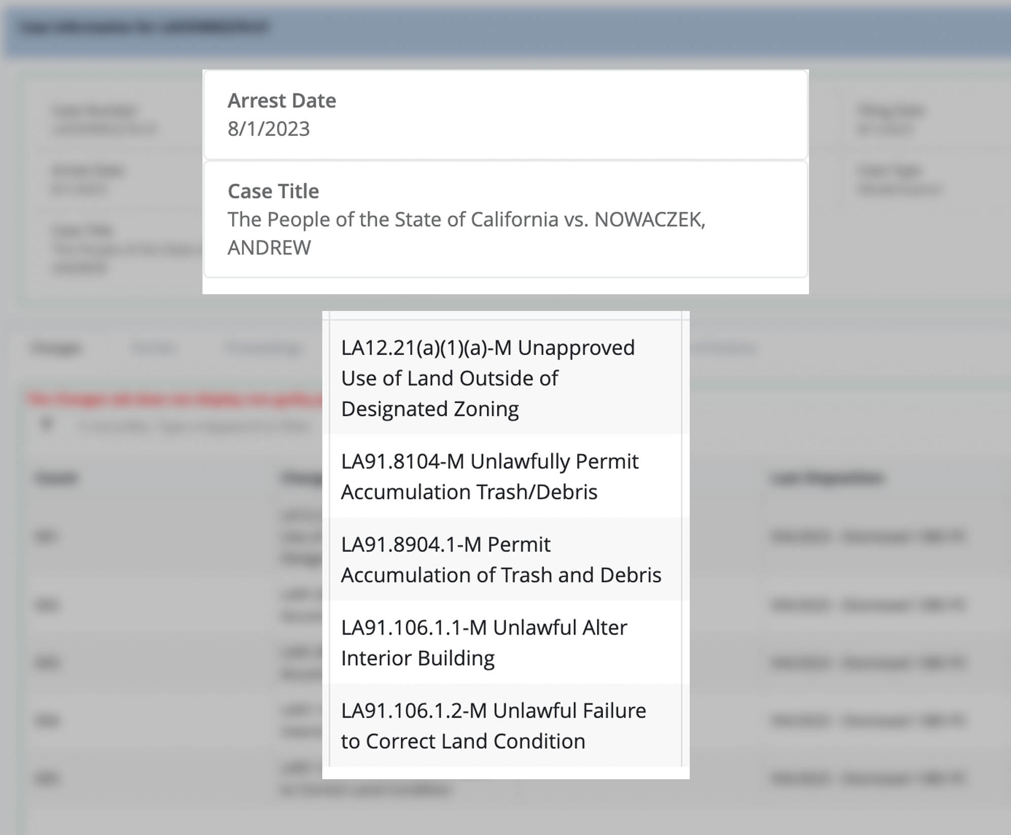 Andrew charged with zoning violations, unlawful failure to correct land conditions, and other property related crimes. Andrew was arraigned on September 9, 2023. It appears the court dismissed the charges following corrective action by Andrew.