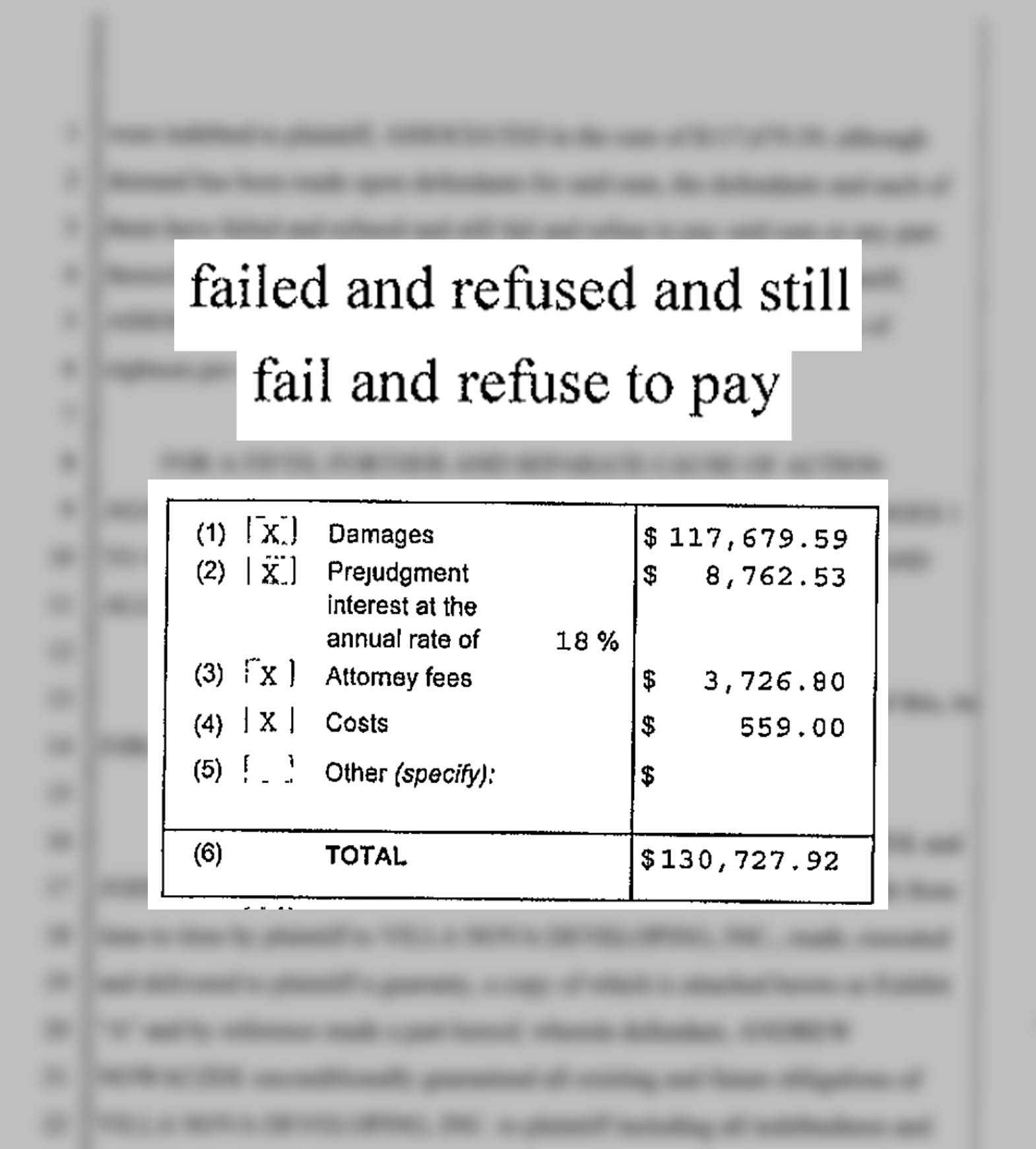 Andrew Nowaczek "sabotaged" project; hands "pitch black", owes millions.