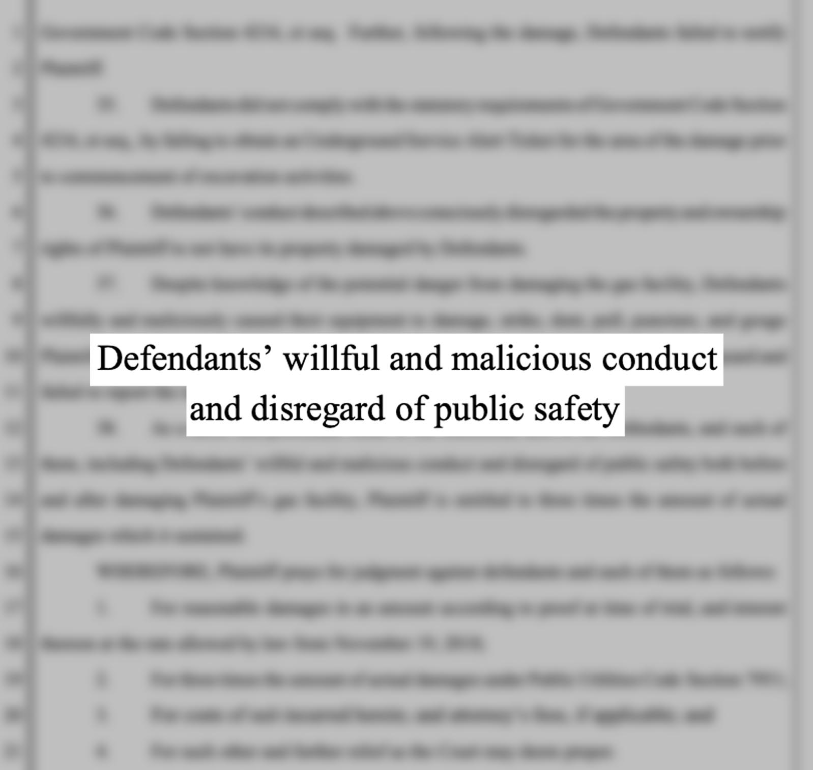 SoCal Gas complains that Andrew "acted willfully and maliciously and in conscious disregard of the rights and safety of others by excavating adjacent to, above or near a known active gas facility that was potentially hazardous to workers or the public...